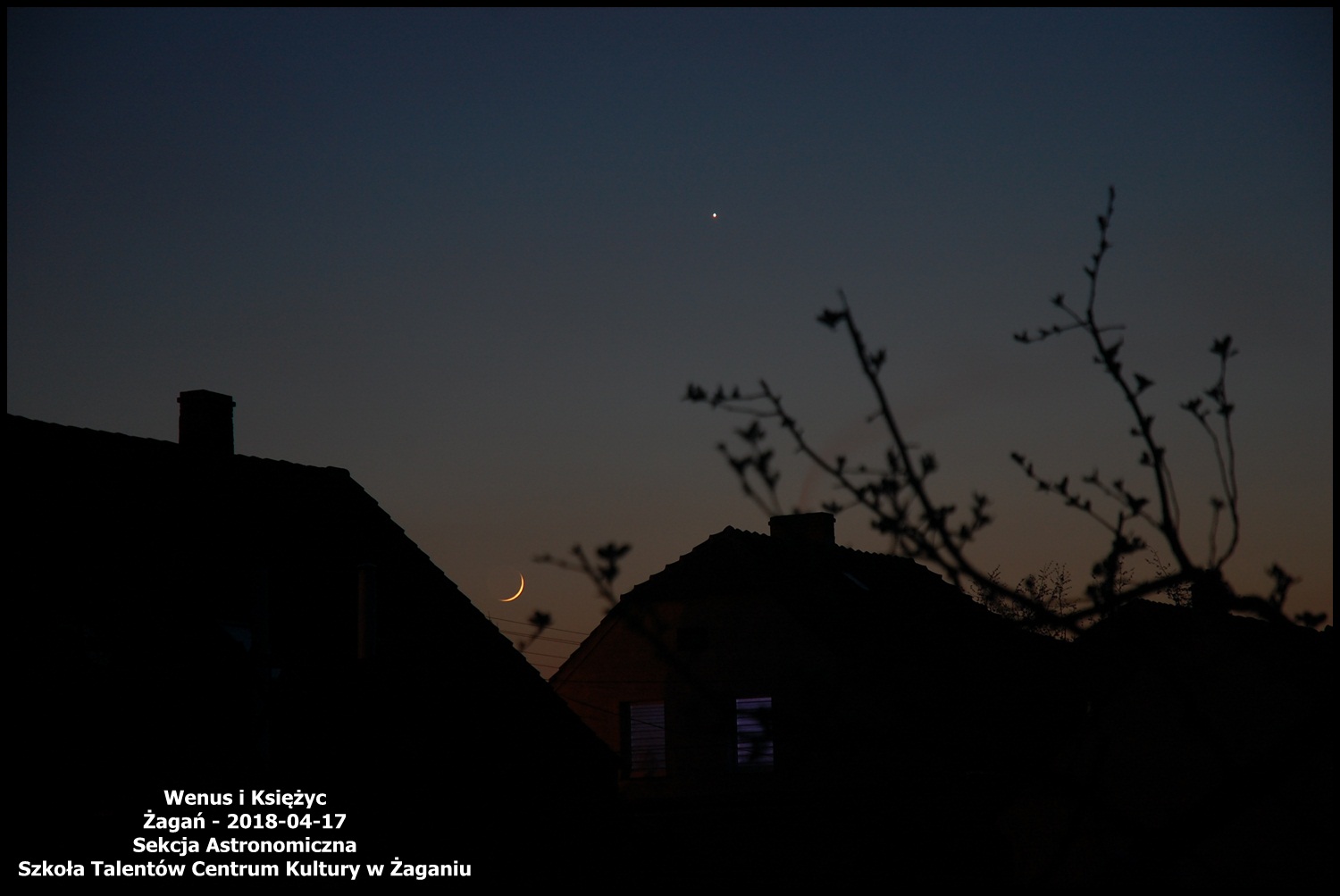 Koniunkcja to spotkanie na nieboskłonie dwóch lub więcej ciał niebieskich - Księżyca, planet które zmieniają swoje położenie wśród gwiazd. Te obiekty nie muszą, i najczęściej nie są, w swoim pobliżu. A najczęściej znajdują się niezwykle daleko od siebie w skali kosmicznej. W naszym przypadku Księżyc krążąc wokół Ziemi znajduję się na niebie w pobliżu miejsca, gdzie jest Wenus, choć ta okrąża Słońce i znajduje się w rzeczywistości bardzo daleko od Księżyca. Ale widok ich razem jest wspaniały. Sami zobaczcie: